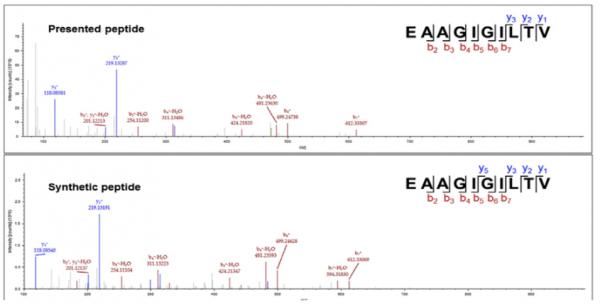 圖3 純化后的MEL 624.38黑素瘤細(xì)胞的HLA-A2呈遞的肽和合成的MART-126-35 MS光譜比