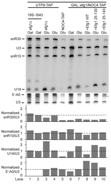 真核生物中的核糖體生物成因是一個復(fù)雜的過程,涉及許多組裝因子和snoRNA的結(jié)合和解離。酵母小核糖體亞基首先組裝成90S前核糖體。核糖體組裝因子 Efg1是與早期的90S有關(guān)的蛋白質(zhì)。文章對Efg1的結(jié)構(gòu)和功能進(jìn)行了分析,利用BeaverBeadsTM protein A(20102)包被rabbit-IgG捕獲RNA,通過免疫沉淀(IP)提取RNA進(jìn)行測定。遺傳分析表明,Efg1的功能核心含有兩個由高度保守的殘基組成的螺旋發(fā)夾。Efg1的缺失會擾亂18S rRNA 5'結(jié)構(gòu)域的組裝并抑制U14 snoRNA從90S的釋放。