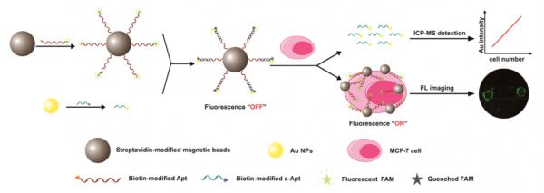 該研究開發(fā)了一種用于癌癥早期診斷的多模式檢測技術(shù)的新方法。方法使用基于適配體的雙功能探針,通過電感耦合等離子體質(zhì)譜(ICP-MS)和熒光成像對人乳腺癌細(xì)胞MCF-7進(jìn)行快速、靈敏、特異性的計數(shù)和可視化分析。該探針由特異性捕獲癌細(xì)胞的適體識別單元,基于熒光共振能量轉(zhuǎn)移成像的熒光染料基團(tuán)(FAM)以及金納米顆粒(Au NPs)標(biāo)簽組成。實驗將MB-Apt-FAM-Au NP綴合物通過鏈霉親和素和生物素之間的特異性結(jié)合固定在BeaverBeadsTM Streptavidin(22308)表面,從而可以進(jìn)行ICP-MS定量和熒光猝滅測定。同時,由于ICP-MS中Au NPs的信號放大效應(yīng)和低光譜干擾,具有較高的線性和靈敏度。該研究為MCF-7細(xì)胞的定量測定和可視化信息獲取建立了快速簡單的方法。