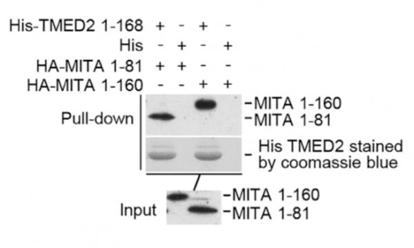 該研究將細(xì)菌表達(dá)的His標(biāo)記的TMED2截短體(His-TMED2)與BeaverBeadsTM IDA-Nickel(70501)偶聯(lián),然后與表達(dá)F-MITA截短體的HEK293細(xì)胞提取物一起孵育。通過用SDS上樣緩沖液煮沸洗脫與磁珠結(jié)合的蛋白質(zhì),并進(jìn)行了免疫印跡或考馬斯藍(lán)染色分析。